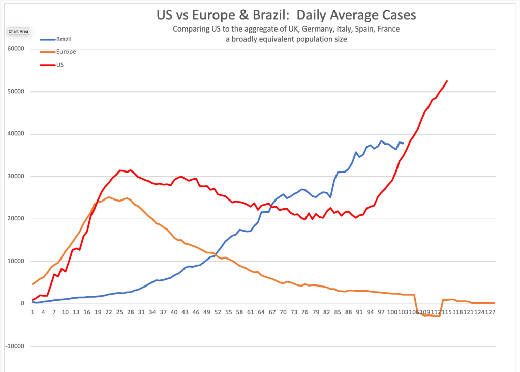 Brazil daily new case aveage is around 37,000 (Brazil has a population of 208m – so prorating that for the US would give around 57,000 daily cases).