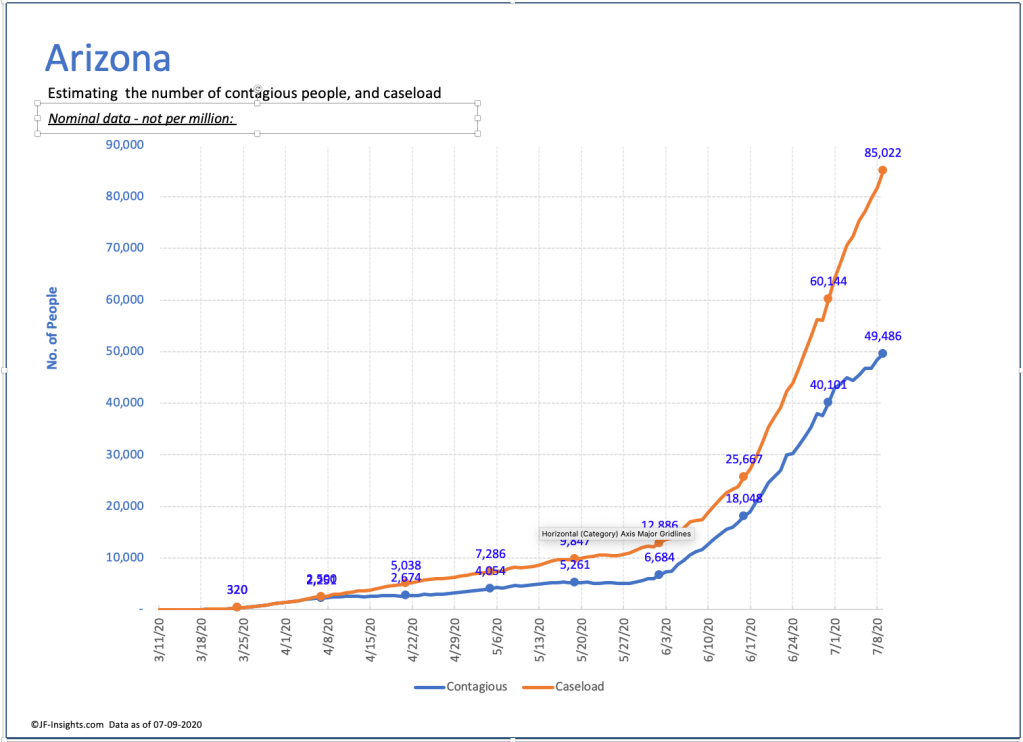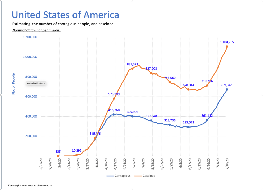 First a couple of definition. Contagious = the sum of everyone tested positive over the last 2 weeks. Caseload is everyone tested positive over the last month (i.e. includes contagious people plus everyone coping with the virus). The data assumes a 1 month period of coping – which will be different person to person – but sounds a reasonable assumption for the 3 million + cases we have been running in the US.