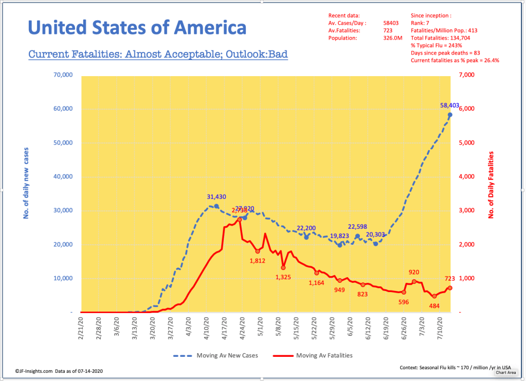 For 4 of the last 7 days the US has exceeded 60,000 new COVID cases per day. That has now pulled up the 7 day moving average to about 58,000 per day. Over the last 2 weeks alone approx 750,000 people have been tested positive. That means – they are all contagious and should be self isolating.