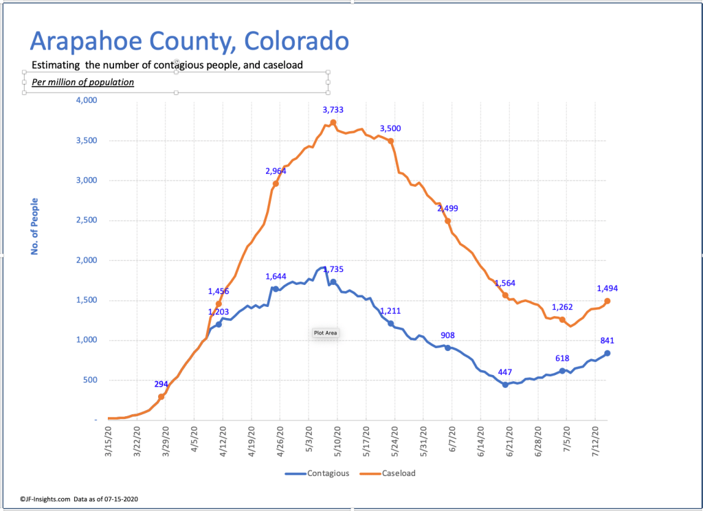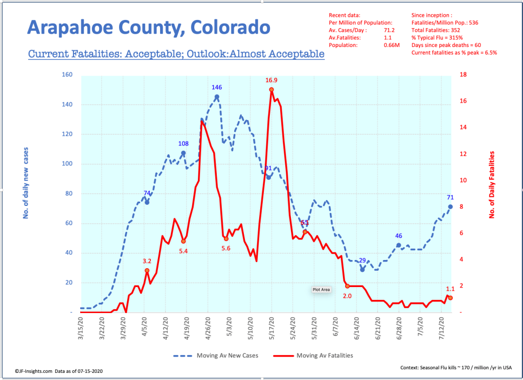 Take a look at one example – a relatively rocky road – but reasonably under control now. This shows that nothing is flawless. They did a great job of reducing cases in the critical Memorial Day – period. Even in this example from Colorado – cases are trending up now – but they are not at critical level yet. There’s no time to become complacent.