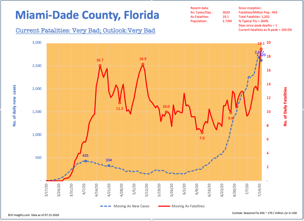 Deaths have never been higher – currently at about 19 per day. The prior highest number (7 day average) in April was 16.7. But deaths are a lagging indicator – the April numbers I mentioned above took until May 10th to work thru their cycle. As such we can expect average daily deaths in August in Miami to be much higher than today.