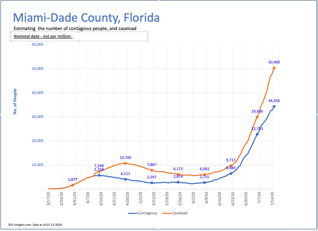 Lets look at case load and contagious people – based on confirmed COVID case data. Back in April – Miami had a peak daily average new case figure of 435 on April 8th. As you can see – that resulted in the first hump of this curve (in blue) shortly thereafter on April 15th of 5650 people contagious (those diagnosed in a 2 week period). The number of people who were coping with COVID (assumed to be a 1 month period) – peaked at 10,709 on April 28th. Thru April 30th – Miami recorded 12,000 cases and 352 deaths.