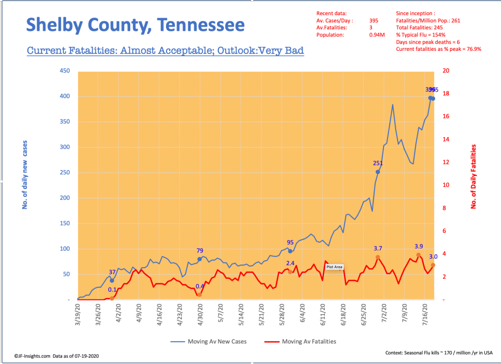 I’m looking at the fatality data for Tennessee – and looking at the counties with relatively high number of deaths. Shelby County, population almost 1 million has the highest number of deaths of any county in Tennessee. Shelby is home to Memphis.
