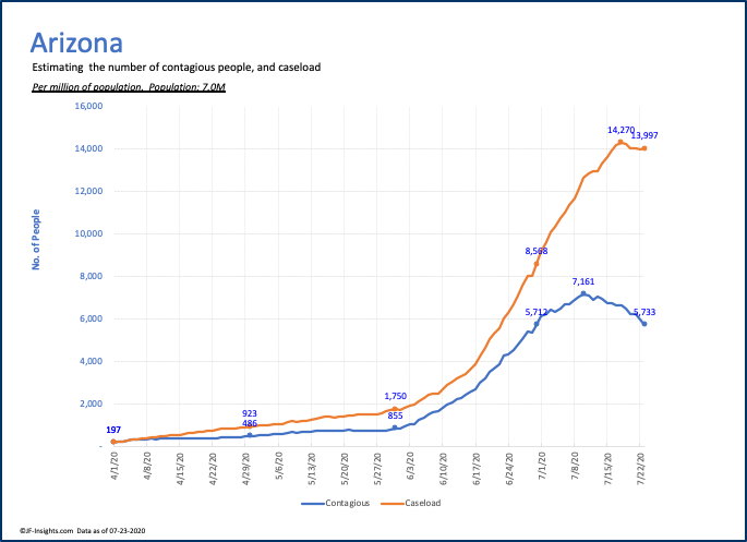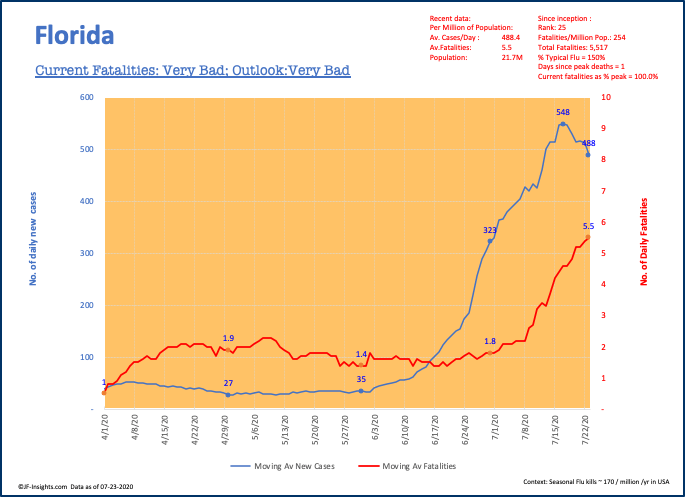 The 7 day average for new cases in Florida has fallen by about 10% in the last week. Peak new cases per millio was 584, the current figure is 488. That’s welcome news. In plain numbers – that’s around 10,000 new cases per day – versus a peak of about 15,000 per day on 12th July.