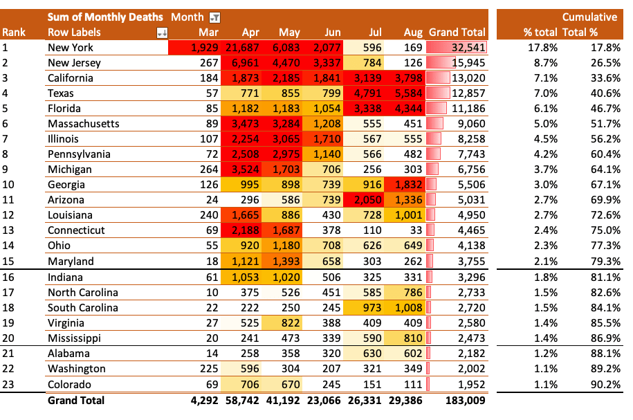As you can see in this image – 23 states cumulatively add up to 93% of all deaths. Collectively they add up to over 165,000 deaths