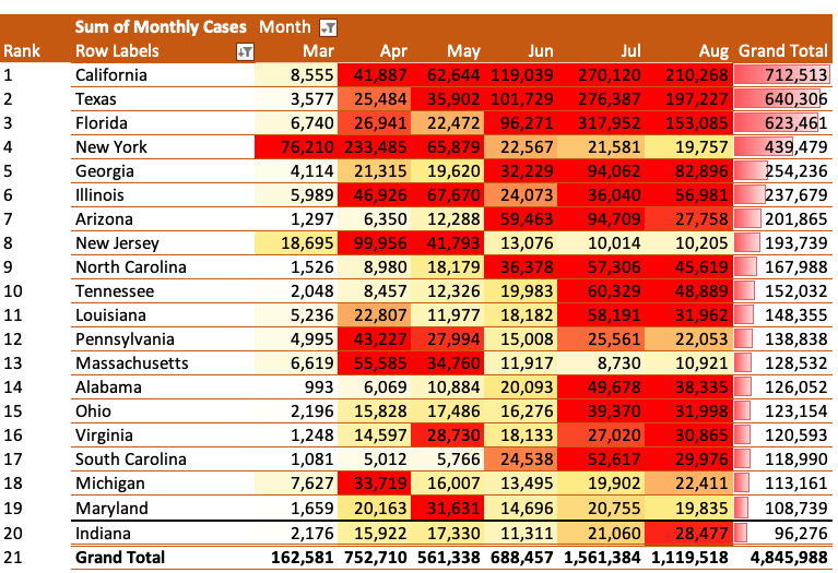 The red formatting shows those months with ~2000 or more deaths. Notice how the North East is red for the first 3 months – and then these states start to get the numbers under control. Most of the North East is severely affected (March though June) as you can see from the list.