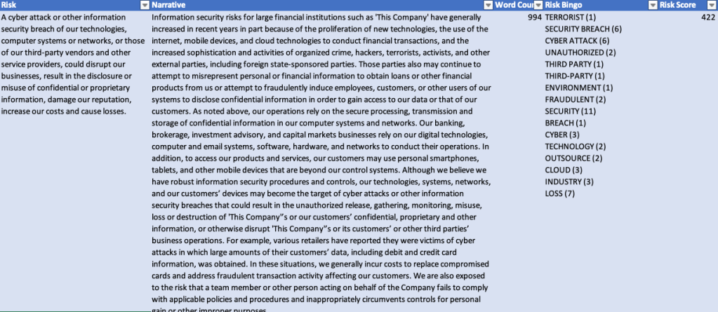 My own example here, helps me hone in on those areas of 10k’s which may be more important for my review. As you can see – I’m able to generate a risk score based on my subjective assessment of that risk. In my tool, “Material Weakness” gets the highest risk score. That helps guide me to the paragraphs I’m more interested in.
