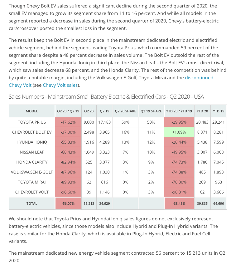 Chevy Bolt had 2,498 sales in Q2 – though while down on the same period last year is apparently up in market share. That doesn’t sound so bad does it.