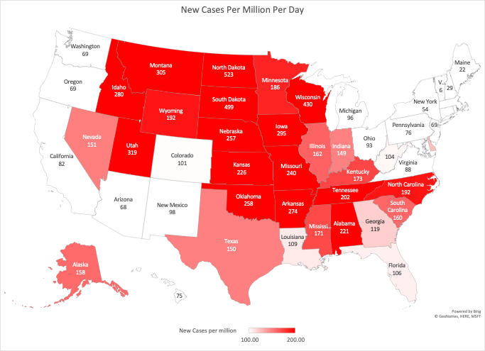 The current global leader in new cases is Israel – at over 540 new cases per million per day. Context – Israel has 9 million people. North Dakota exceeds Israel.