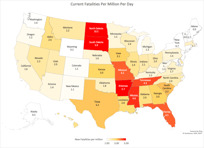 Now I’ll be the first to say – there is ZERO cause for complacency. In fact many states are TOO complacent. Check out the map of the US below – and you can see a diagonal band of states with case levels far too high. North Dakota for example would be a world leader if it were a standalone country. Not good.