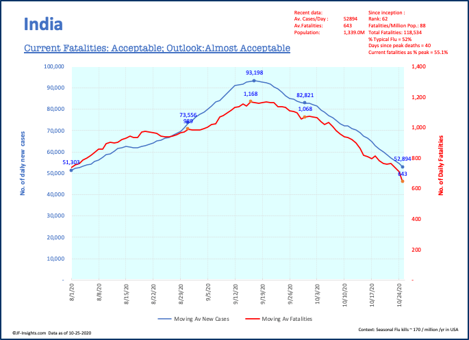 I used to compare INDIA to the US. India has a much bigger population than the US at about 1.3bn people – and for a while was heading to a point where it would be the world’s #1 in terms of total COVID cases. Now the data in India is pointing to lower numbers than the US. From a peak of about 93,000 average daily new cases in mid September to 53,000 currently.