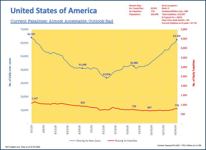 Lets look at this. In mid September – just before the Labor Day holiday impact could be reflected in the numbers – the average daily number of new COVID cases was 34,000. Currently we are close to twice that (62,000 daily case average) and the number is rising strongly (Oct 25th saw 82,630 new cases).