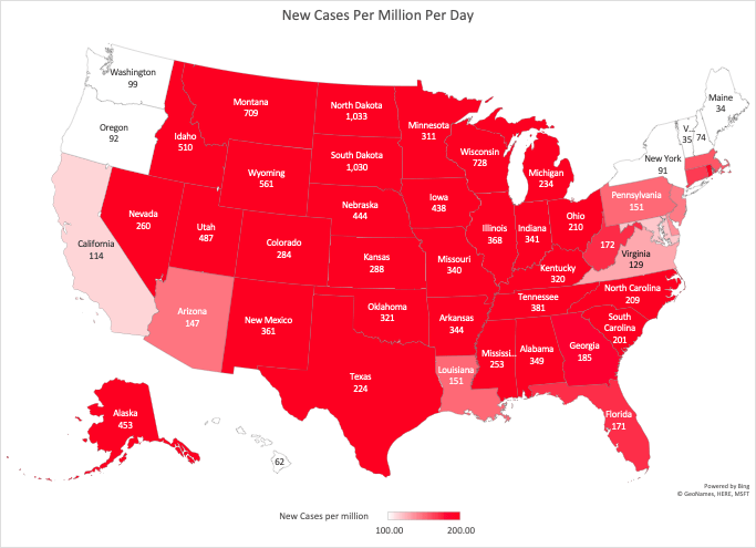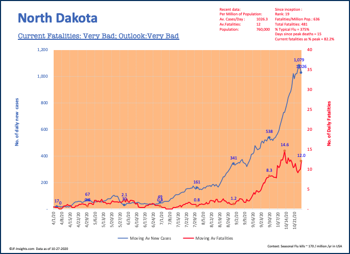 North Dakota leads the way. Population 0.76 million – currently averaging 780 new cases per day and 9 deaths per day. Expressed in per million terms – to facilitate easy comparions across all US states, it is at 1,032 cases per day – and 12 deaths per day. Those measures are the highest in the country.