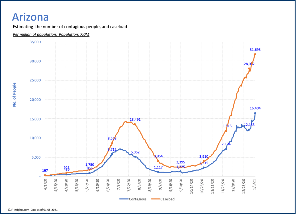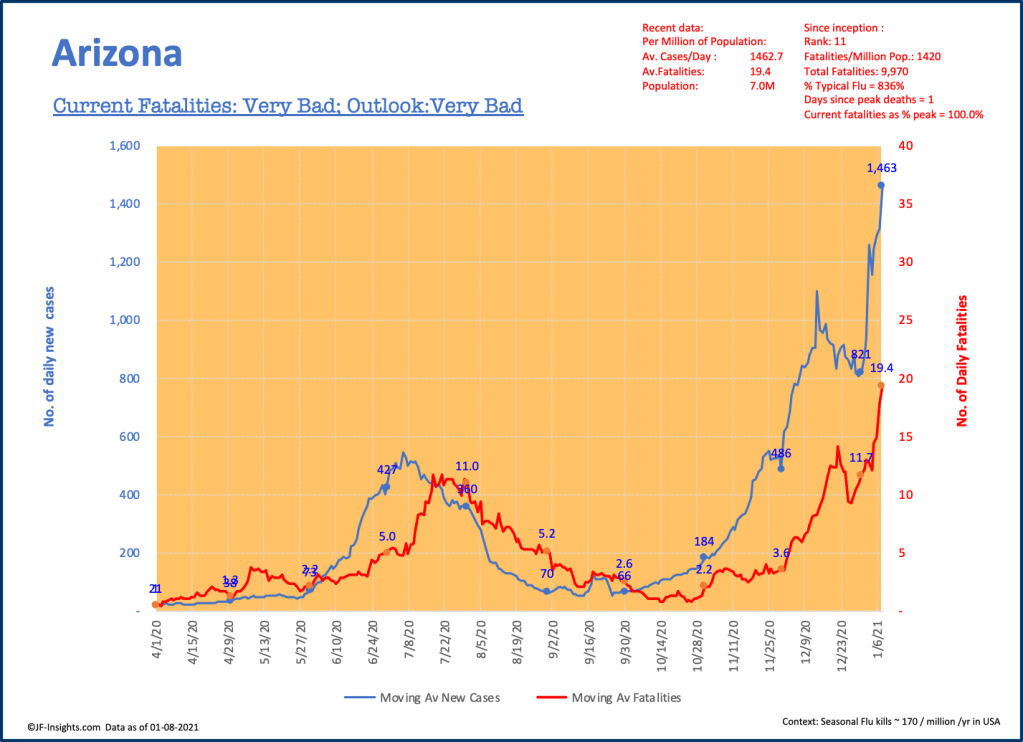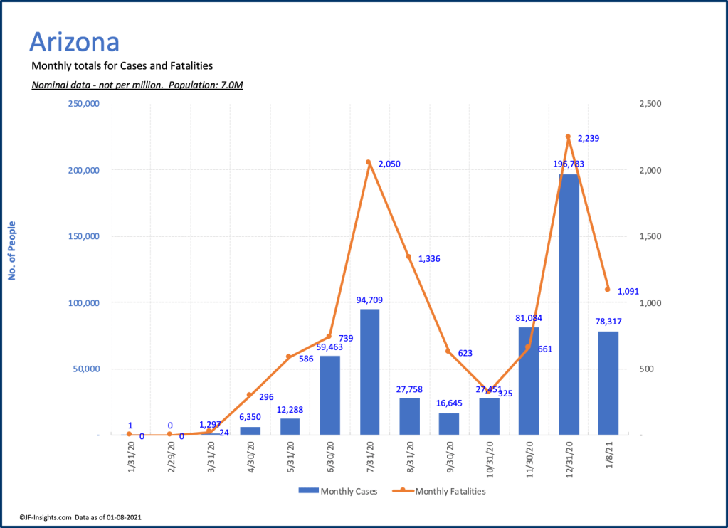 In July, Arizona recorded 2,050 deaths and 94,000 cases for the month. In December it recorded 2,200 deaths and 197,000 cases. So far, in the first 8 days of January it has recorded almost 1,100 deaths. Clearly January will almost certainly set new records for Arizona.