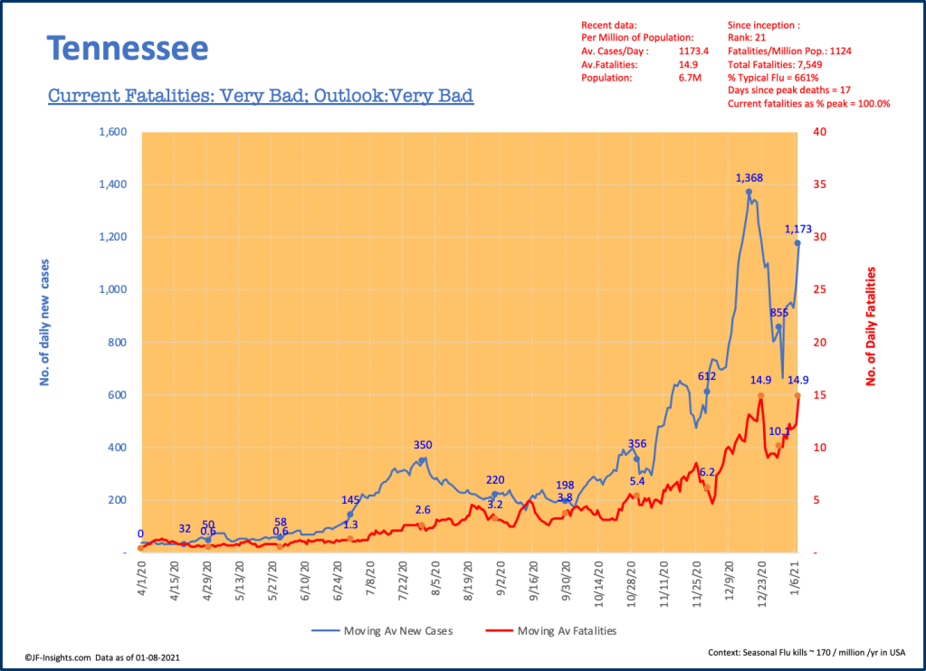 Per the charts below, Tennesse actually has more new cases per million (7 day average) than California. Amost 1200 new cases per million per day. California is around 1,000 new cases per million per day.