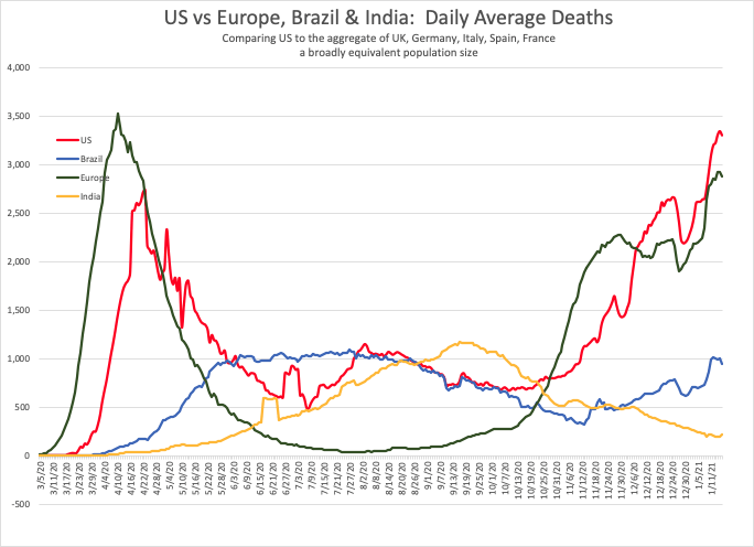 The chart below isn’t adjusted for per capita (if it was India would seem even better) – but the countries I selected in Europe equate to roughly the population of the US. Brazil has a population of 250m.