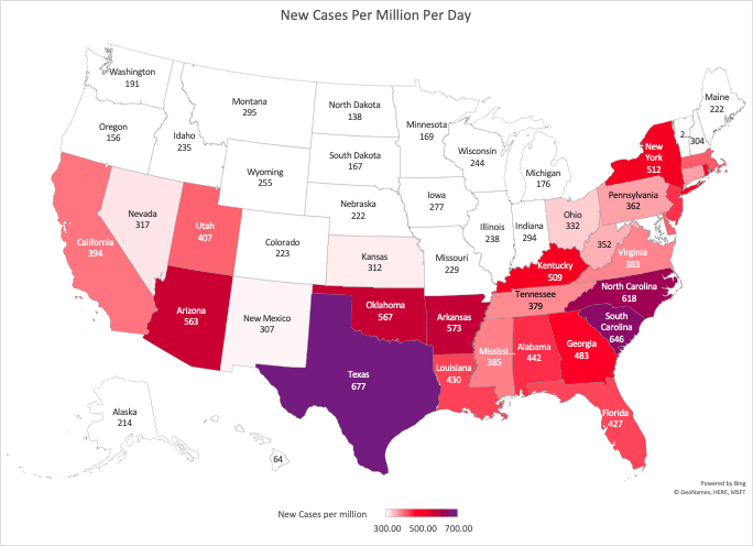 Compare my chart below with that on previous blog posts. Certainly a more continued, broad based reduction in cases. Arizona is no longer the top spot for new cases (well done Arizona). The top spots now are Texas, and South Carolina.