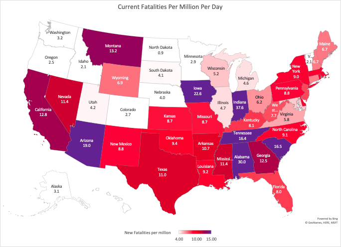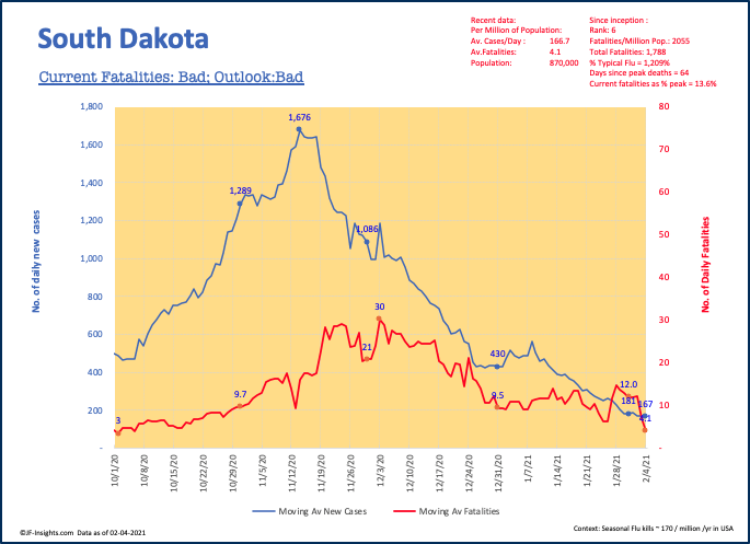 South Dakota has now reduced the caseload to very acceptable levels. Current fatalities at 4.1. per million per day are not in the acceptable range yet – but are far below the 30 per million per day at the peak