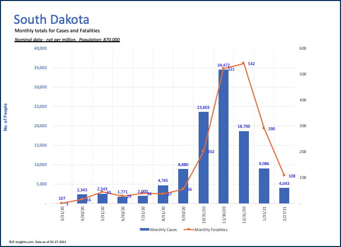 As you can see in the chart below, SD cases peaked in November. However in a state of only 870,000 people – SD experienced far higher case loads and fatalities than necessary.
