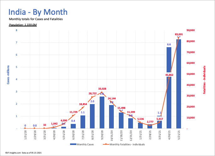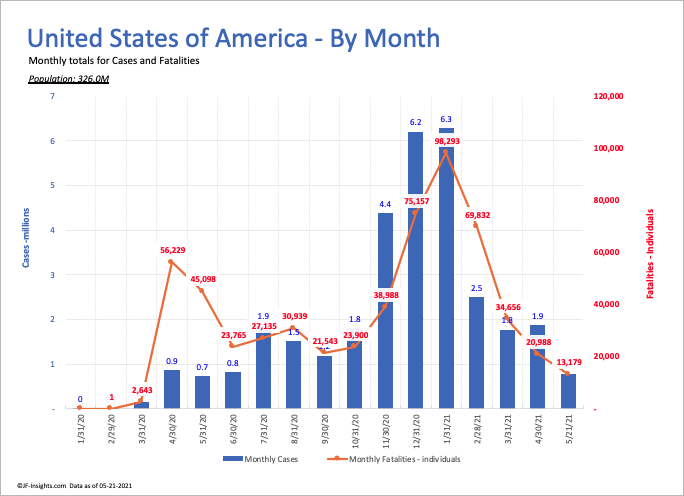 Although cases for the month of May (to 5-21-21) are 7.3 million and fatalities are 83,000. That’s still an average of over 4,000 deaths per day.