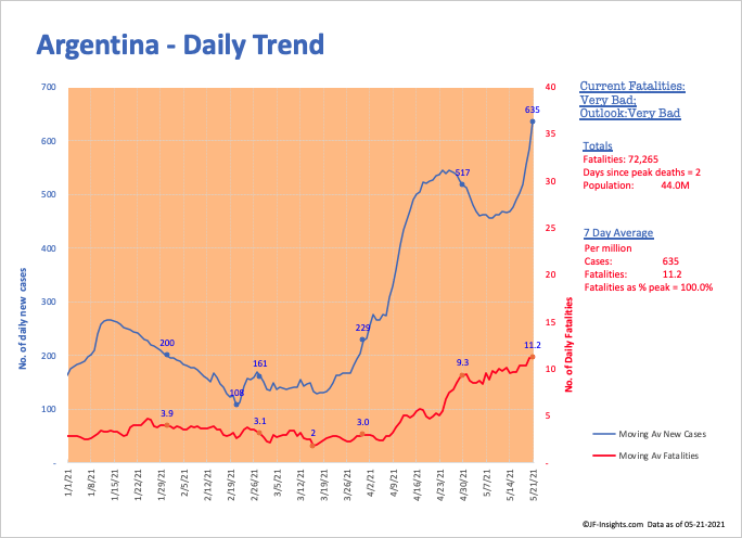 Argentina never really bent the curve – as is shown in the chart below. Fatalities per million per day are at an alarming level – on an increasing case load: