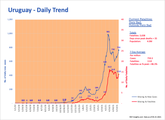 Uruguay’s a different story. Seemingly relatively untouched by COVID in 2020 – the current 2021 wave is far more persistent and troubling. Of note however, the population is 4 million. This should be a small enough population to quickly vaccinate, if international assistance can be provided (that’s half the population of Israel).