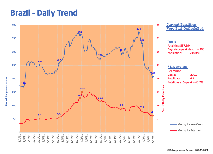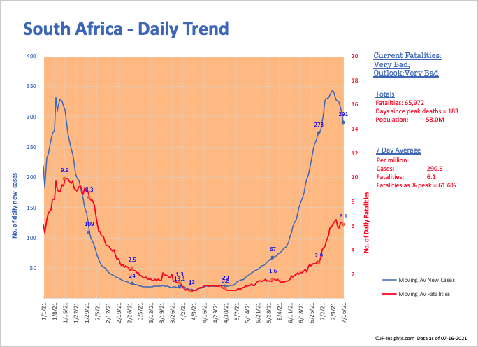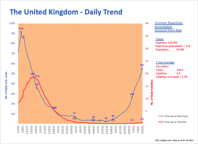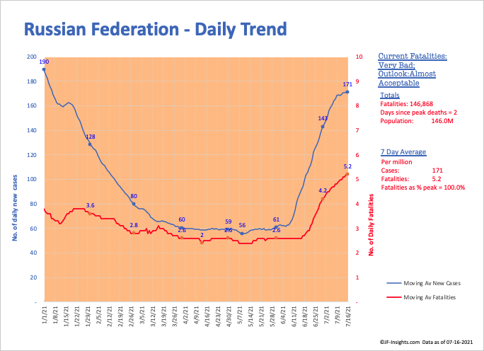 UK Cases are Sharply Up – but fatalities are not as bad due to vaccination of the vulnerableRussia’s cases and fatalities sharply risingSimilar story to the UK; sharply rising cases but not fatalities