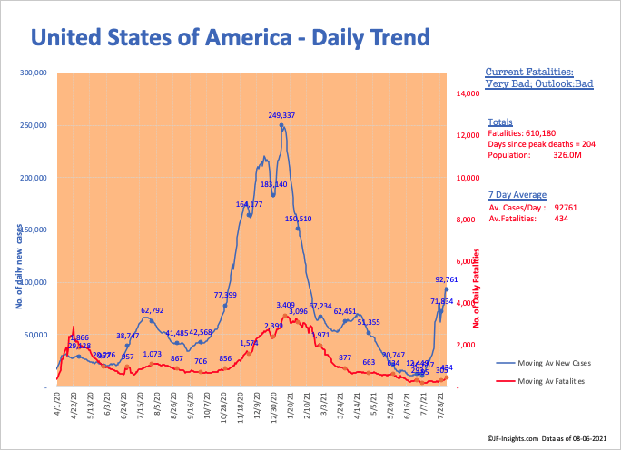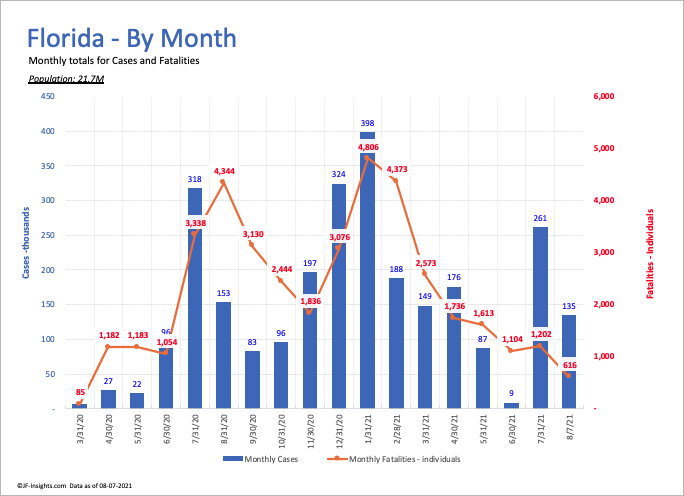 Florida hits its 4 wave of COVID – with the Delta variant – and average deaths per day are at levels seen in March of this year. Current case numbers are higher than at ANY TIME since the inception of the pandemic. Almost 20,000 new cases per day.