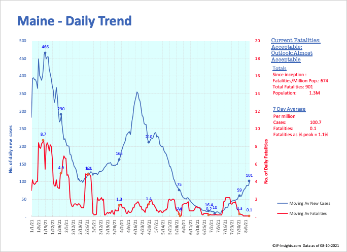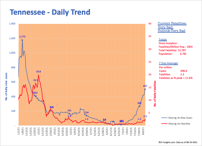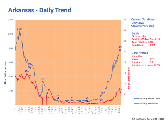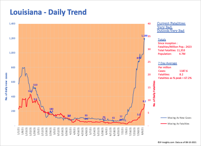 Louisiana has eclipsed this year’s peak in average daily cases. Not surprisingly fatalities are sharply rising