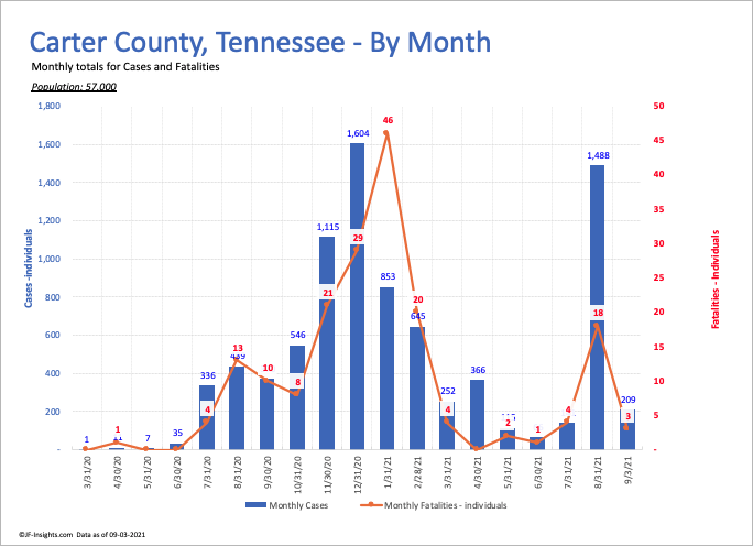 From the chart below – we can see peak deaths occurred in January at 46. Zero deaths in April and very few in May and June. The we see the rise of COVID Delta. 4 deaths in July (perhaps no too alarming); but then 18 deaths in the month of August.