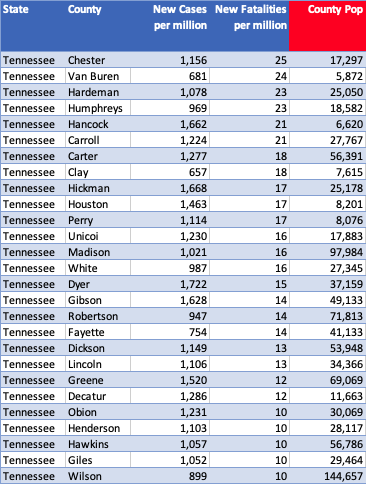 What’s behind Tennessee’s rise to the number 1 COVID hotspot in the country? The data might surprise you, it surprised me. I had thought the rise was consistent across the state. The answer is rural populations. Counties with populations greater than 200,000 have, so far, fared better than those with smaller populations.