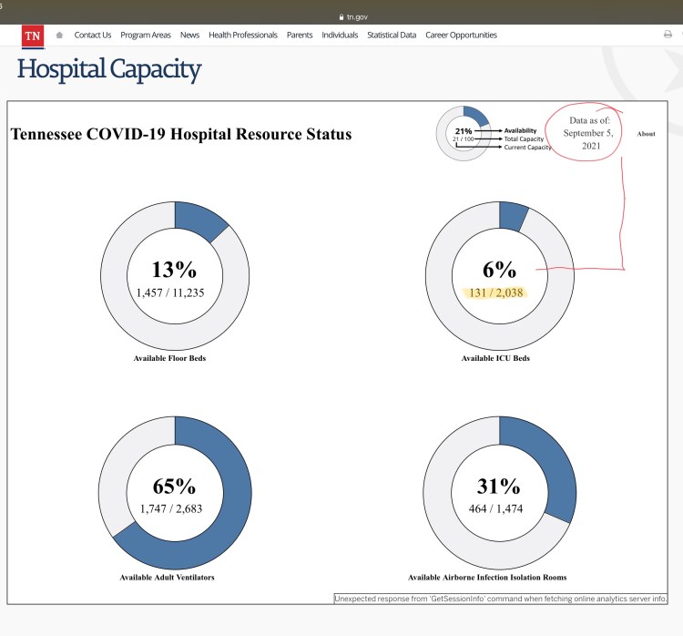 Check out these stats available from Tennessee state government. For a state population of close to 7 million we now have just 131 ICU beds free.