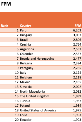 Peru leads the world in reported deaths per capita. As you can see from the table below – almost 2x the number of the second country in the table. Thats a total of almost 200,000 deaths on a population of 32 million people