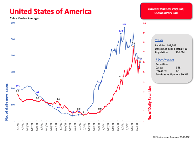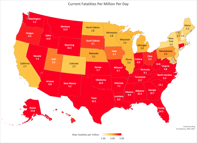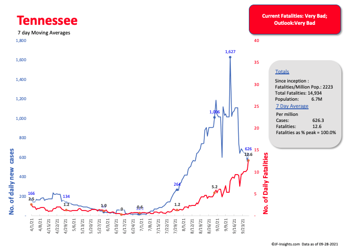Tennessee looks to have broken the curve… from country number 1 in late August. However over 600 cases per million per day is no cause for celebration. Fatalities are way too high.