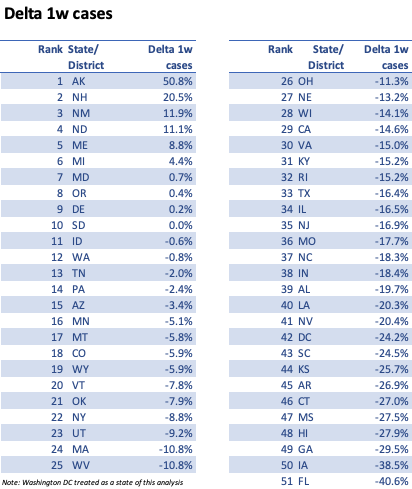 Case numbers are falling significantly in Florida, Georgia, Texas – take a look at the right hand side of this table showing the change in the average daily number of cases week over week.