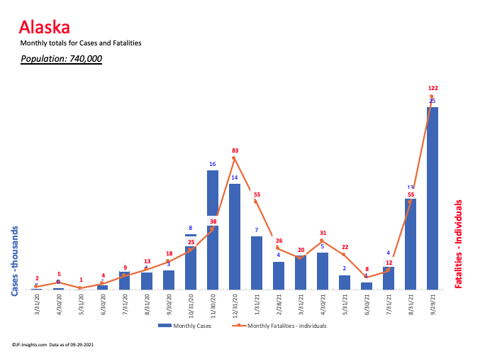 Just like TN’s spike in deaths; now Alaska is facing the same. More people died in Alaska than at ANY month in the pandemic. Think about that for a moment: we are 18 months into a pandemic, we have vaccines that prevent fatalities for many, many people and Alaska records its highest ever month of COVID deaths.