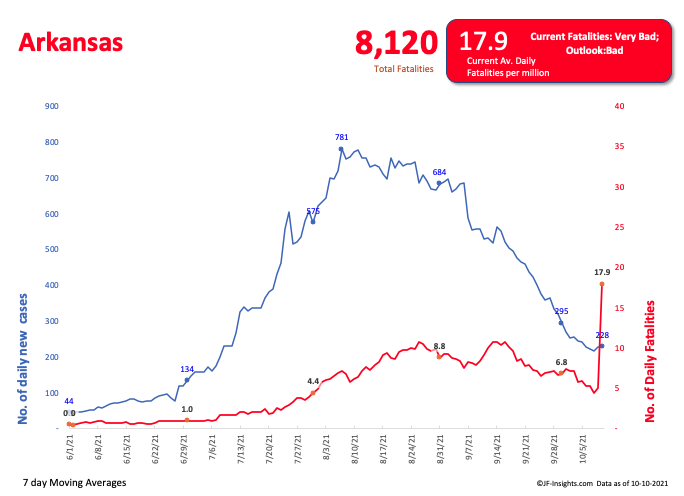 In this scale, anything greater than 2 is bad. Texas in position 10 – is very bad – given its large population – but the numbers for the top 10 states are very bad. Likely driven by cases exceeding hospital capacity.
