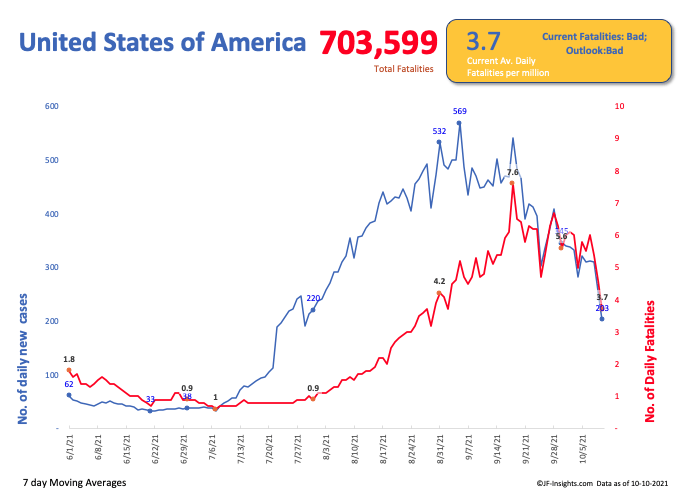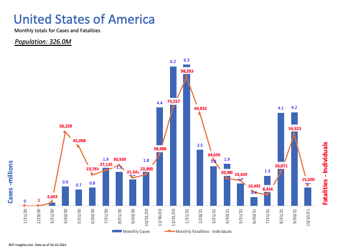 The US had over 50,000 deaths in September 2021 – only 3 other months have exceeded that figure. Recall the situation in April 2020 – at the begining of the covid pandemic when the US recorded 56,000 deaths. We were almost at the exact same number of deaths last month!