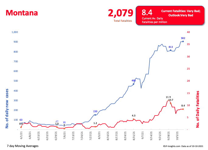 This picture shows it all. The surge of cases that gripped the sourth recently is on a northern expansion. Once again, North Dakota is recording high levels of COVID – but this time – Montana also. I recently reported on Alaska.