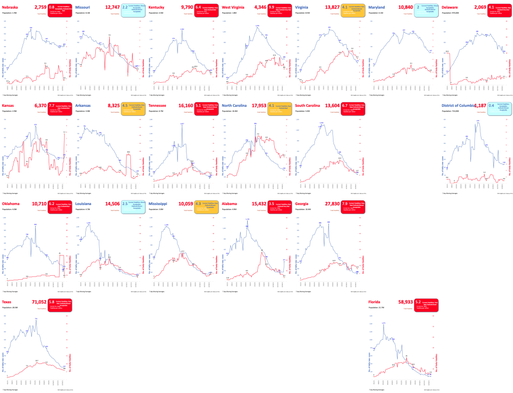 Spot the difference – a very similar pattern emerges in the northern states. Notice the sharply rising fatality rate (red line) in most cases. Idaho is currently on 12.4 COVID deaths per million per day.