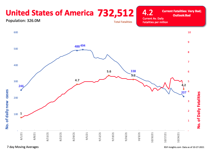 The net result is that the US has definitely bent the curve for new cases; but fatalities are not falling much. Average deaths are 1600 per day.