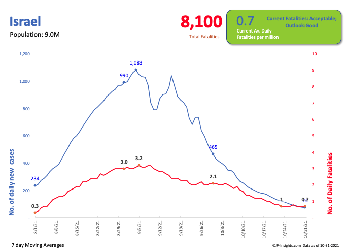 Israel managed to bring down cases and fatalities – and had aggressively rolled out vaccine boosters. Deaths in October were less than half those of September.