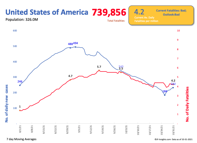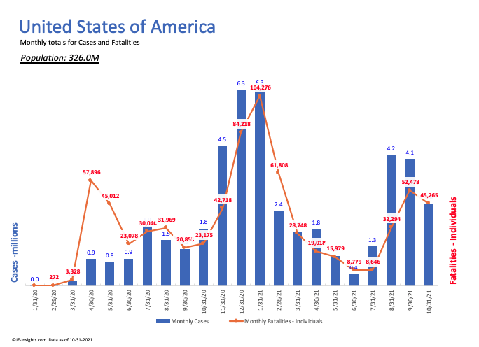 The US still had a very large number of deaths in October – 45,000. Only 5 other months since the inception of the crisis have recorded higher death counts. More to come on that below.