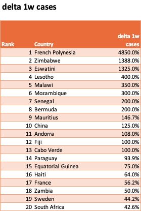 In the case of French Polynesia (population 280,000) the WHO database recorded 683 new cases on Nov 30th – wherease typically 1 or 2. Looks like they are catching up on a backlog of testing or administration.