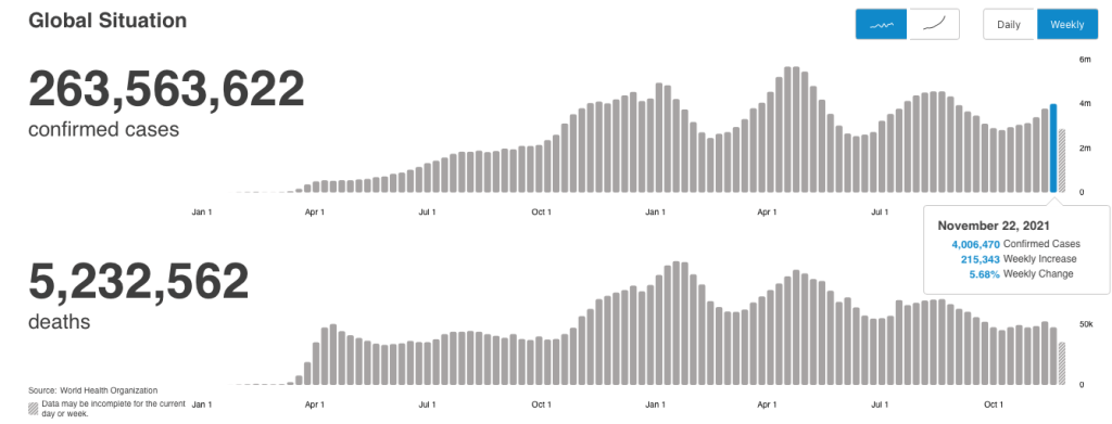 Global cases are again on an upswing. Notice the rising number of cases in the chart below. At about 4m new cases per week – that’s more than 40% greater than week begining October 11th