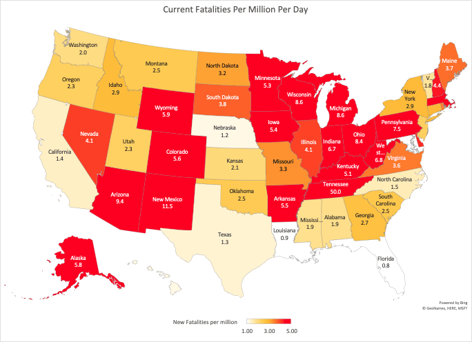 Note: Tennessee is likely due to a data anomaly – or a catch up recording of deaths that were previously not reported. The New York Times data shows a large spike in deaths on Dec 23rd.