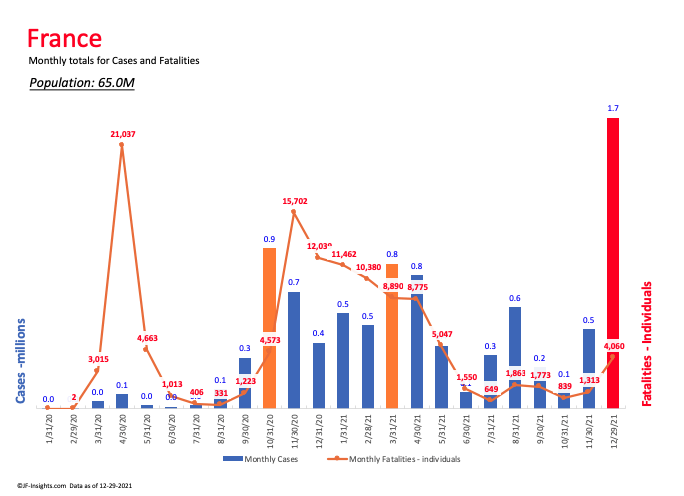 Looking at the monthly charts it’s easy to see the Omicron spread is unprecedented in its rapid pace of spread. Solid bars show number of cases with top 3 values highlighted.