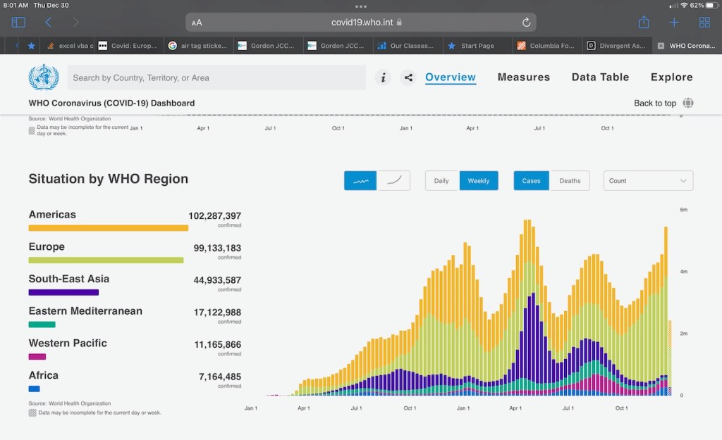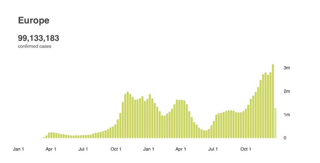 WHO global data shows the following data for new cases – basically virtually matching the peak from April / May (driven out of India and South East Asia). Notice how the green portion of the chart is growing significantly – which is Europe.