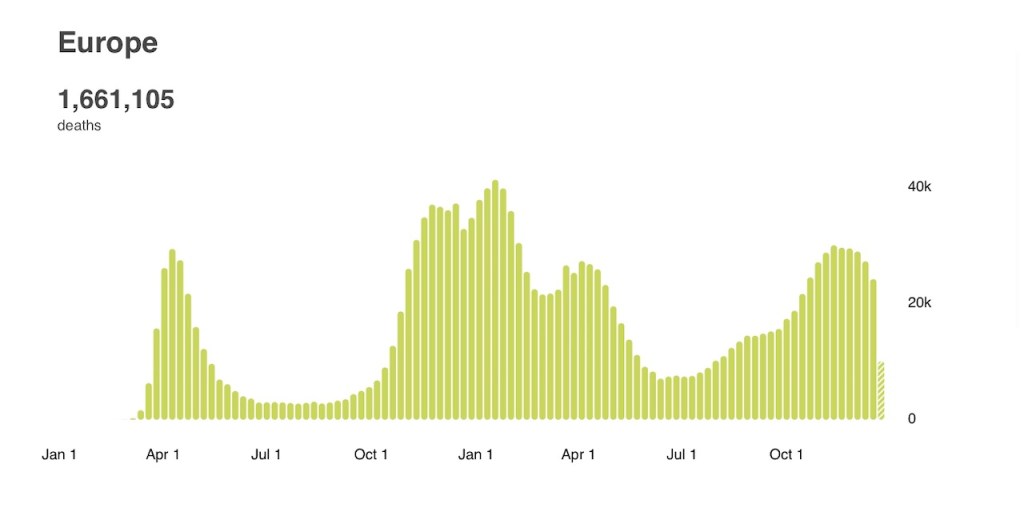 Here’s a closer look at Europe deaths. These are not at the same levels as this time last year (pre vaccination) – but certainly very high. About 60% of prior peaks. Something to be very concerned about.