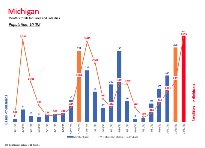 You’ll notice that Michigan features prominently on the list. Here’s how that data plays out across the state. You can see that December was the highest month on record for COVID fatalities. This resulted in 2021 recording more deaths than in 2020 (15,000 versus 13,000).